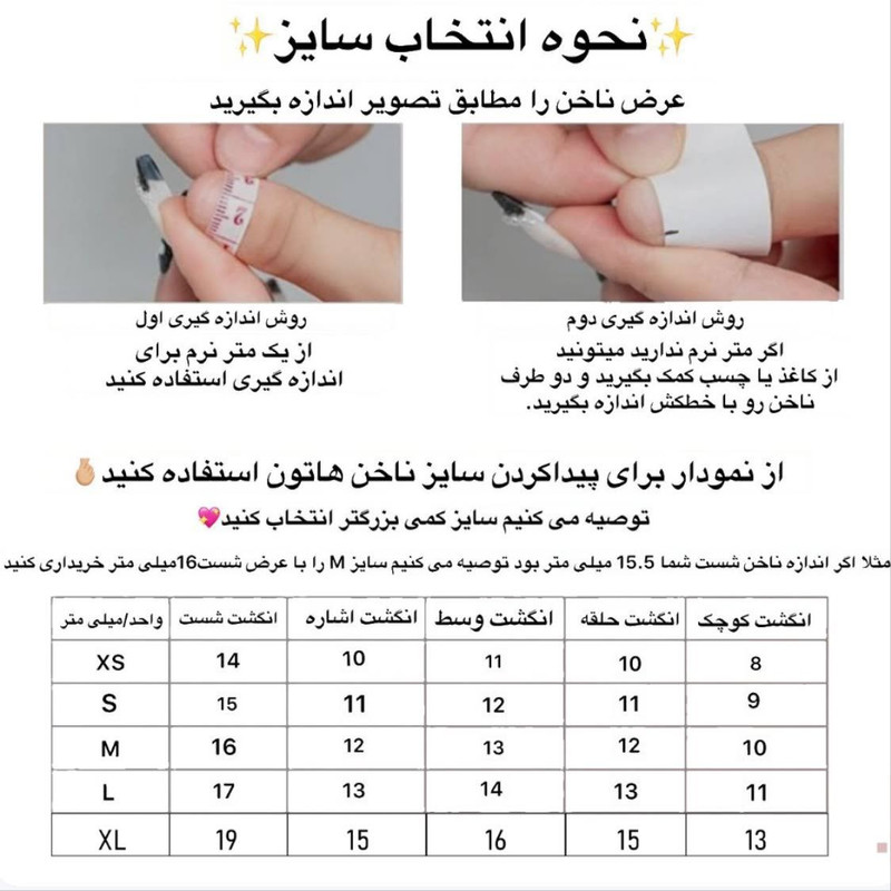 سایر توضیحات | این ناخن مصنوعی با مواد کاشت ساخته شده و به این دلیل بسیار مقاوم است و با مراقبت اصولی میتوان چندین بار از آن استفاده کرد. ضمنا سایز این ناخن مصنوعی small هست. برای سایز گیری ناخن خودتان به تصویر ها مراجعه کنید. اقلام همراه عبارتند از: بافر کوچک پوشر (عقب زن) چوبی پد الکلی |