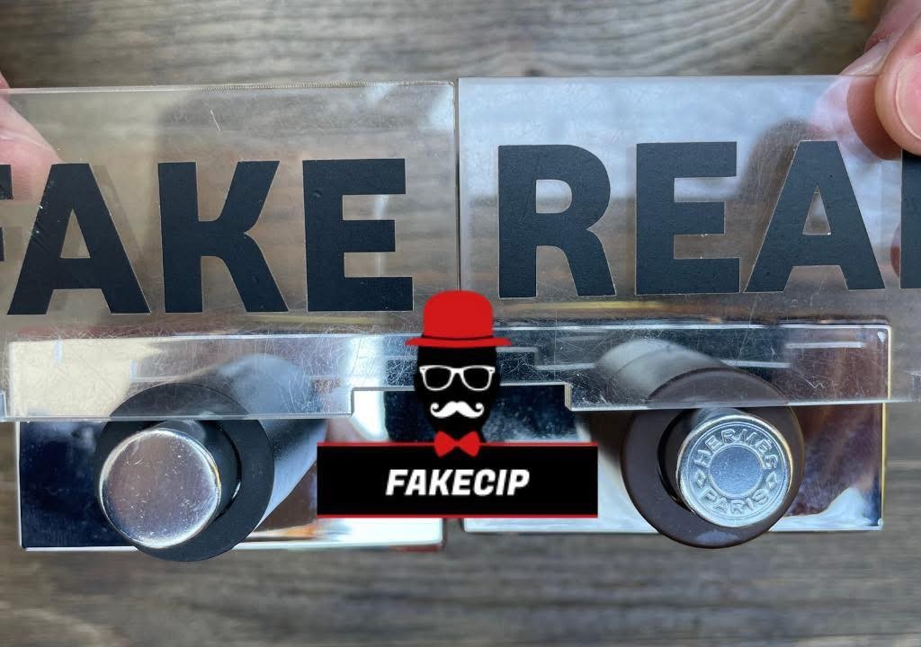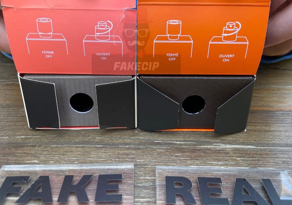 درپوش تق د هرمس اصل قهوهای روشن است و لوگوی Hermès به زیبایی روی آن حک یا برجسته شده است. در نمونههای فیک معمولاً رنگ درپوش تیرهتر یا مشکی و بدون لوگو است.